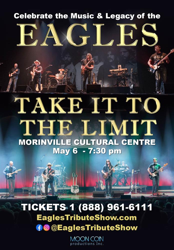 Eagles fans! Mark your calendars because on May 6, 2026,Eagles Tribute - "Take It To The Limit" from Vancouver, is coming to Morinville for the 1st time! Get ready for an unforgettable night of live music as some of Canada's most talented musicians and vocalists bring to life your favourite Eagles hits, including classics like "Hotel California," "Heartache Tonight," "Peaceful Easy Feeling," "Take It To The Limit," "Desperado," "Life In The Fast Lane," "Take It Easy," "Lyin' Eyes," and more!
